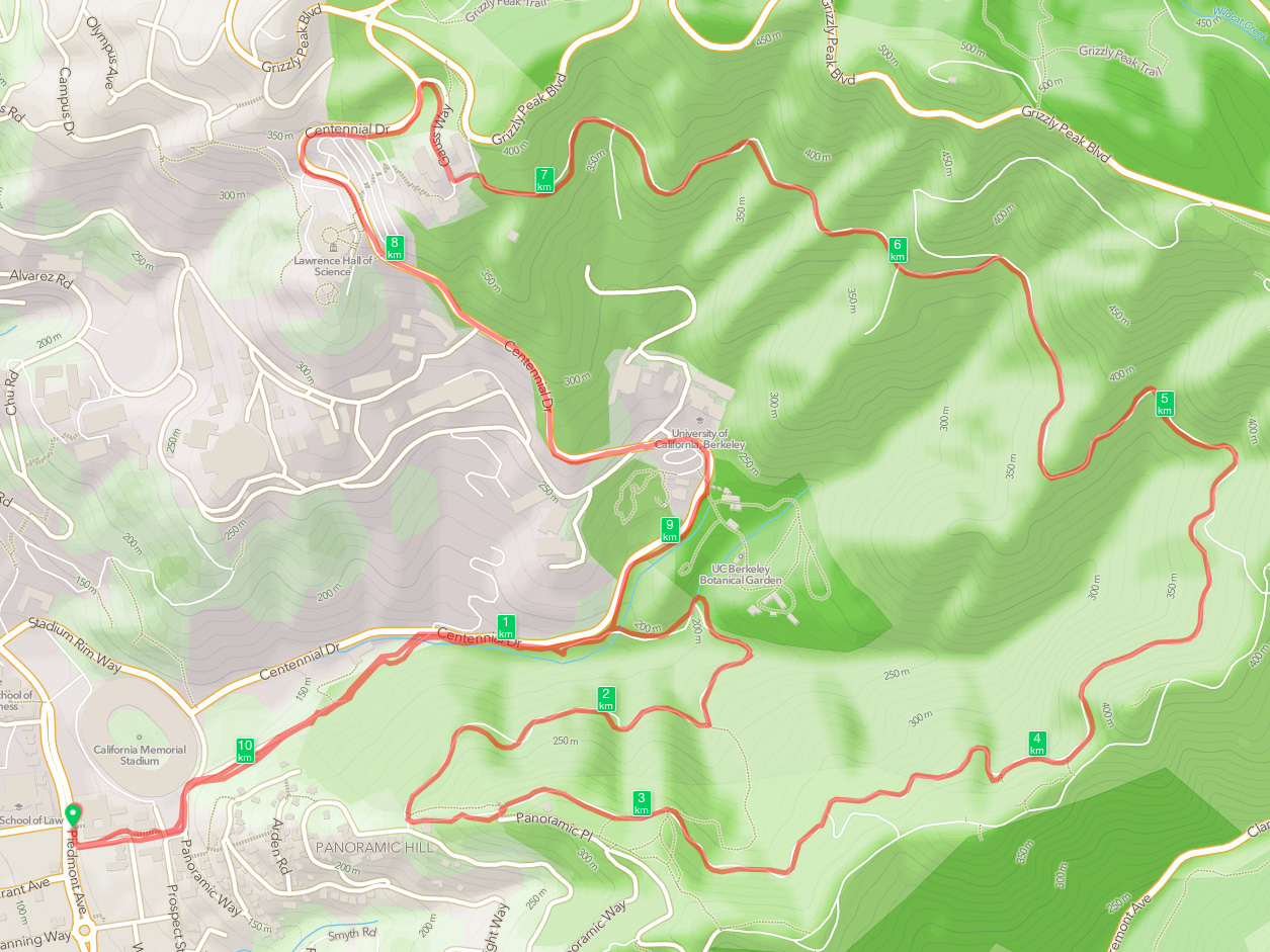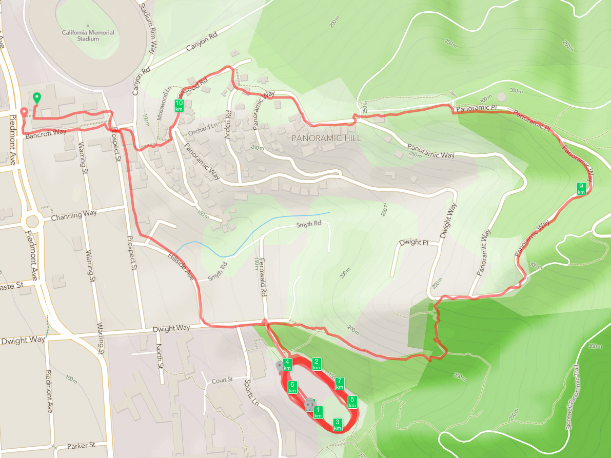 For a short run, you can just do a loop around campus. Above is a two-mile loop that will take you by the stadium, Greek Theater, through some nature on campus, and up Bancroft Ave.