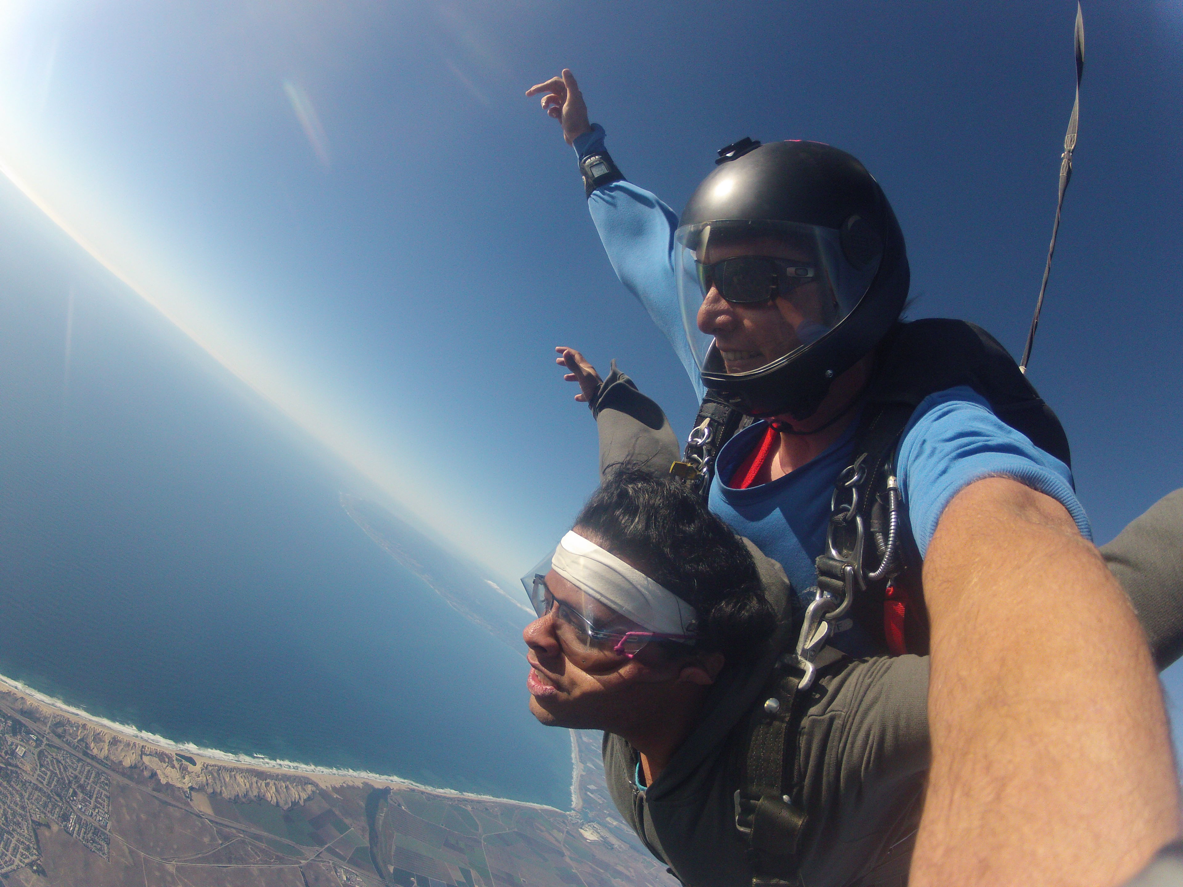 Straight into the world’s highest 18,000 ft. tandem dive, with wind blowing past at 125 mph, it was the ride of a lifetime. The adrenaline rush and the calmness thereafter when the parachute opens and you look down at the beauty that the Earth is, all I can say is we returned new and rejuvenated.