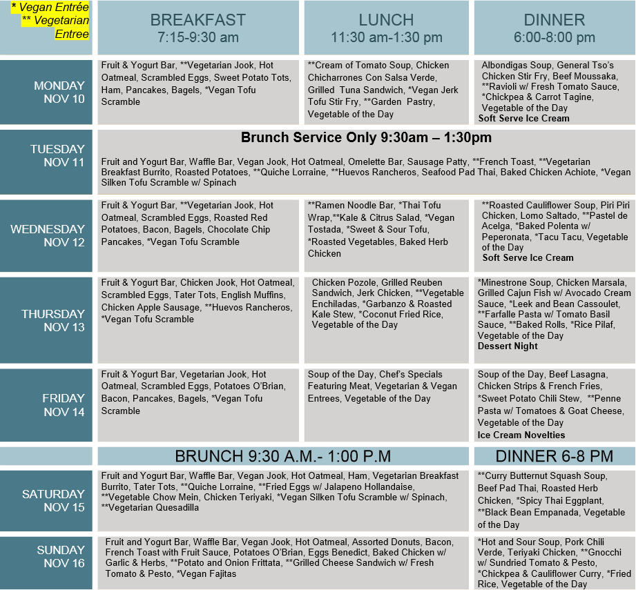 Veterans Day Brunch Menu: Fruit and Yogurt Bar, Waffle Bar, Vegan Jook, Hot Oatmeal, Omelette Bar, Sausage Patty, French Toast, Vegetarian Breakfast Burrito, Roasted Potatoes, Quiche Lorraine, Huevos Rancheros, Seafood Pad Thai, Baked Chicken Achiote, Vegan Silken Tofu Scramble w/Spinach.