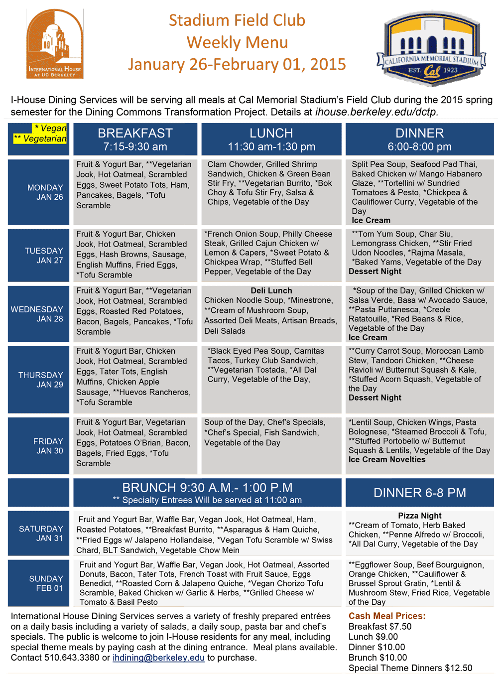 Yes, we will be serving theme meals, your favorites from Fall, as well as some special surprises, so your experience at the Field Club is as fun and exciting as it can be, to match the special place where you will be dining daily – California Memorial Stadium!