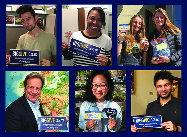 Go to our website and social media outlets to check our matching challenge progress and the fun we are having at I-House! We will be posting special I-House moments throughout the day. You can add yours by sharing a photo or short video on Instagram and Twitter with both #CalBigGive and #InternationalHouse hashtags. Photos will be added to our Big Give 2018 album on Facebook.