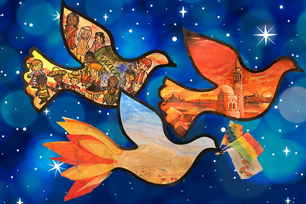 Peace dove graphic with artwork from I-House residents Chrissa da Gomez (Indonesia): left, Hans Gundlach (USA): right, and Isabelle Boni (Bolivia): center