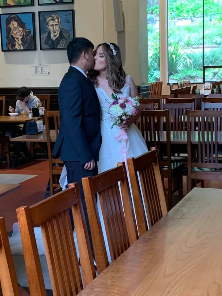 Sneaking a kiss in the place where their love blossomed