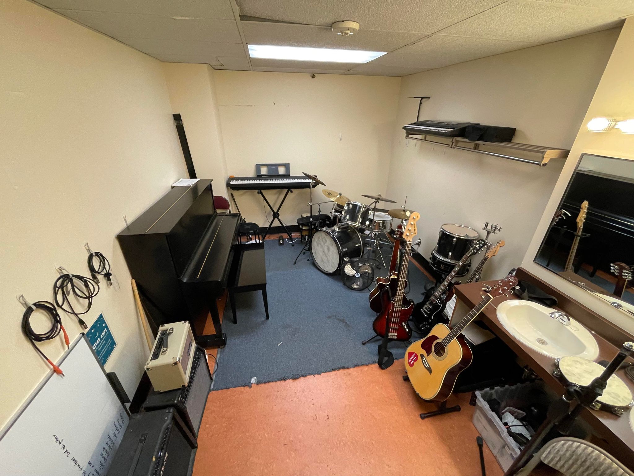 Other facilities include a closet with several board games, puzzles, and sports equipment that residents can use, a ping pong table, a pool table, a TV we can use for karaoke, a music room filled with instruments (including two keyboards, three guitars, and a full drum set), and more!