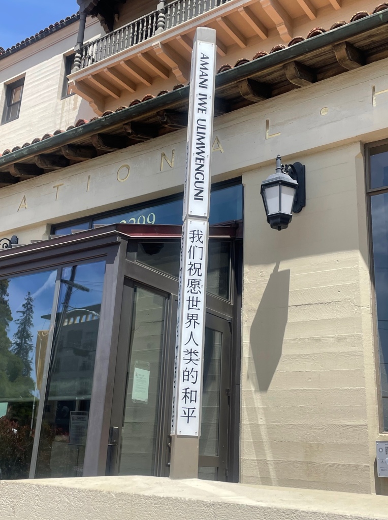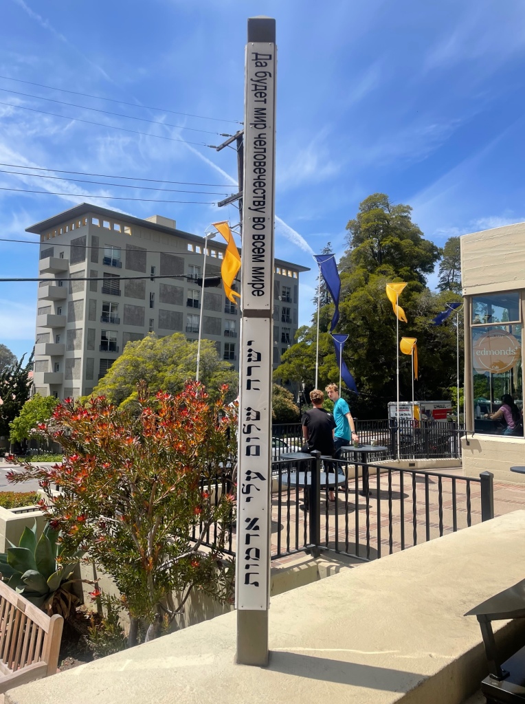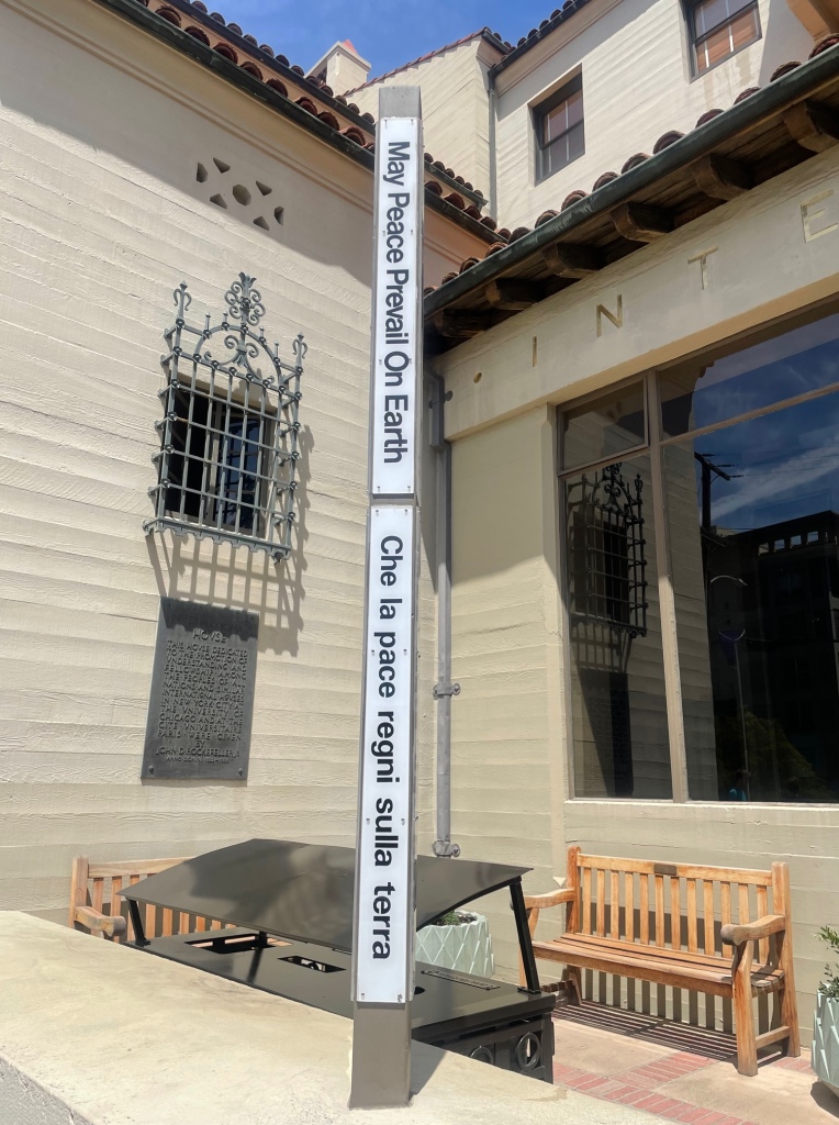 The words “May Peace Prevail on Earth” are written at the entrance on peace poles in sixteen languages.