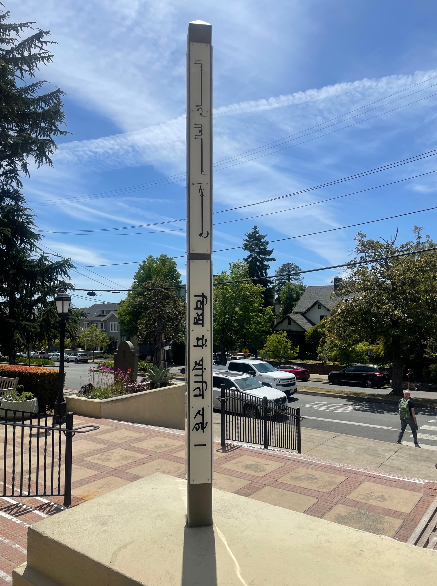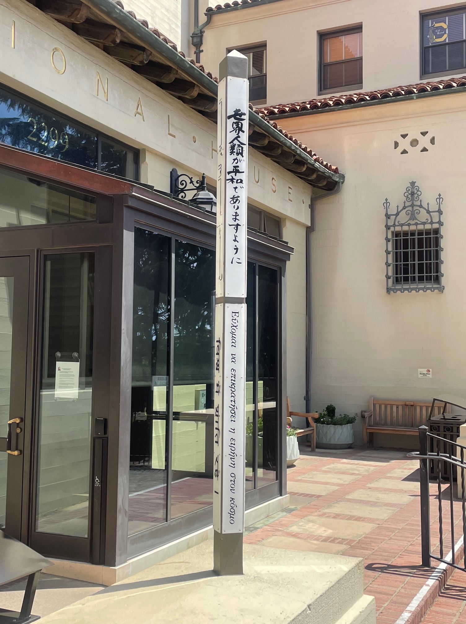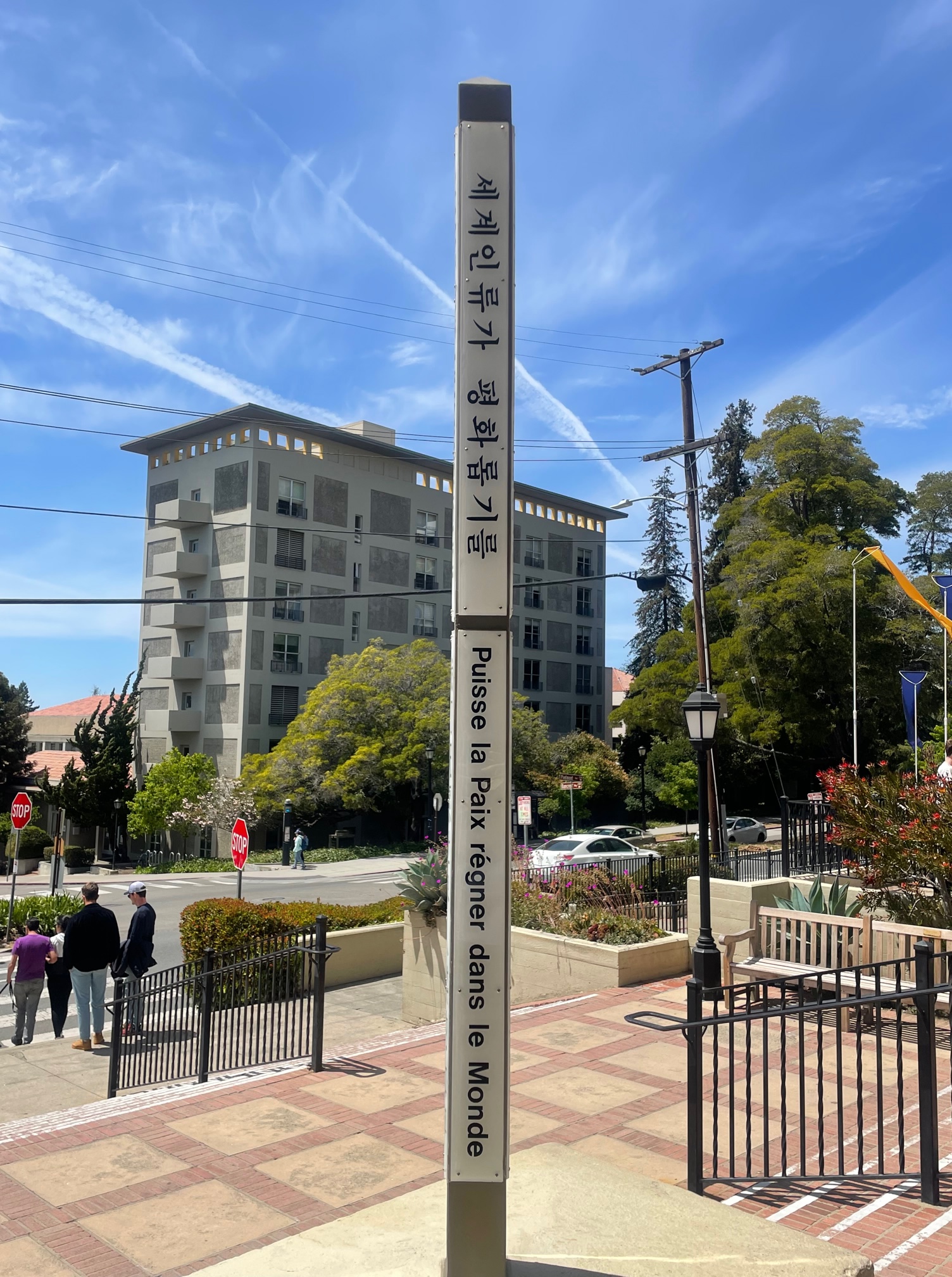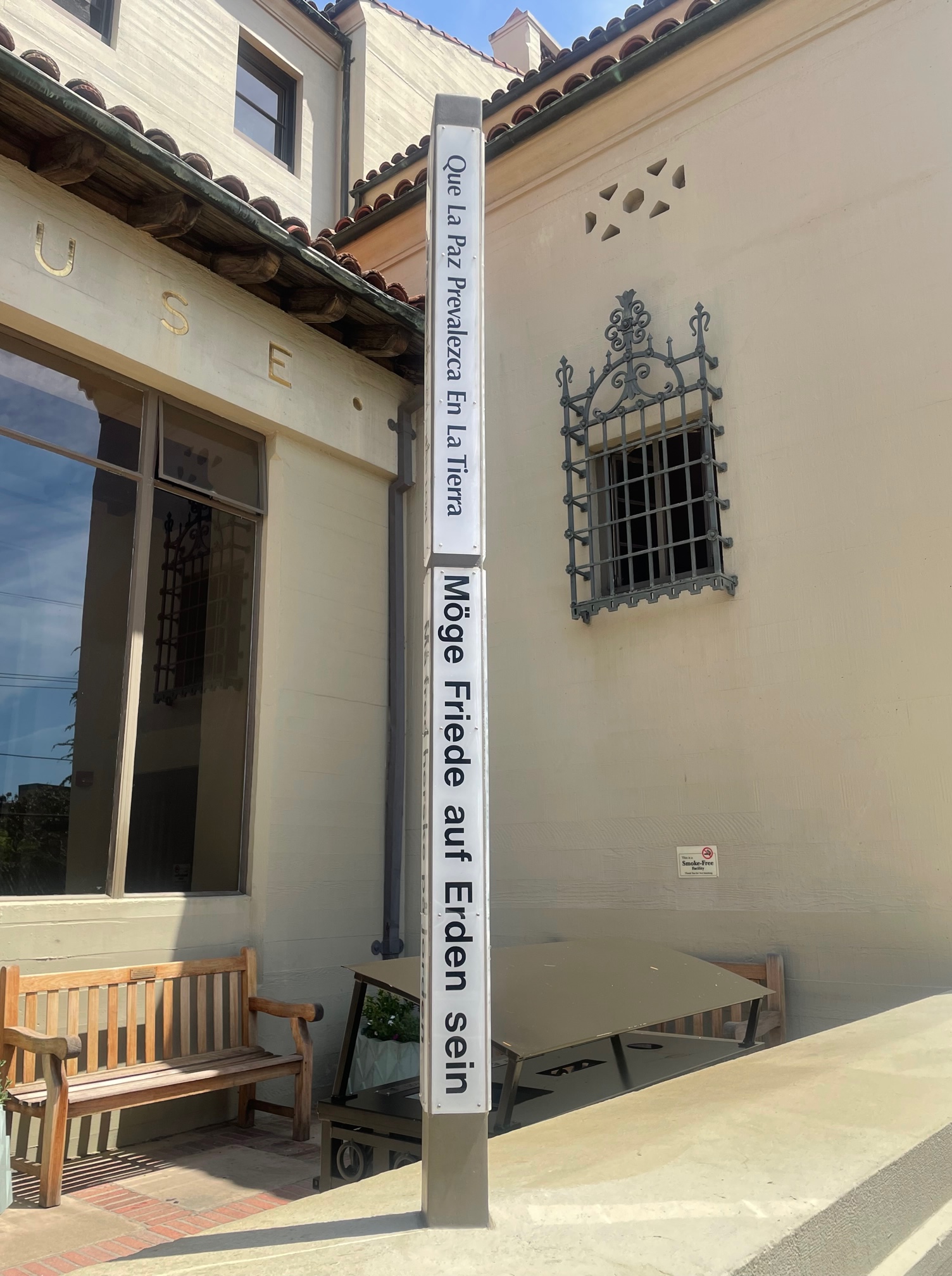 The words “May Peace Prevail on Earth” are written at the entrance on peace poles in sixteen languages.