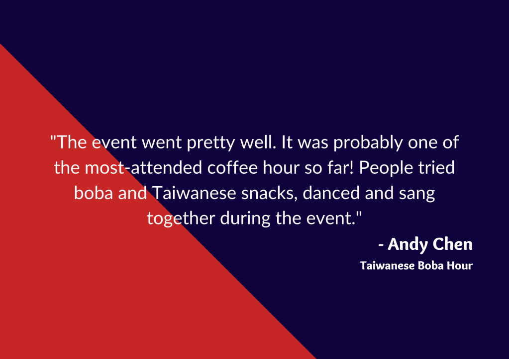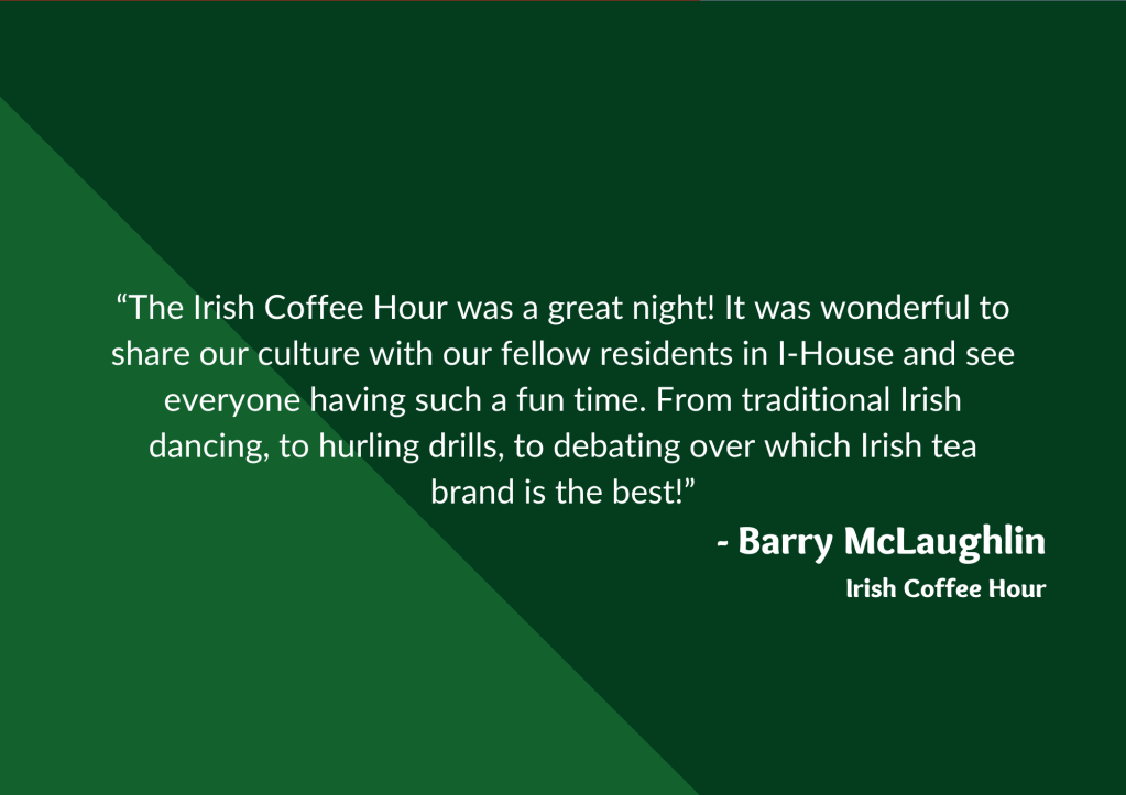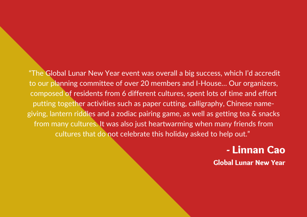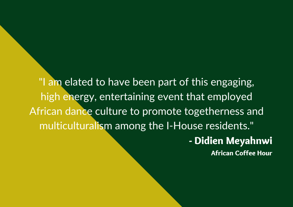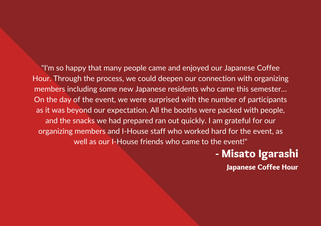 Residents always look forward to our cultural events at I-House—they provide the perfect environment for de-stressing with good food and exciting entertainment, as well as a way to learn more about other residents’ cultures. Here are what some of our resident event organizers had to say about our Coffee Hours and cultural events: