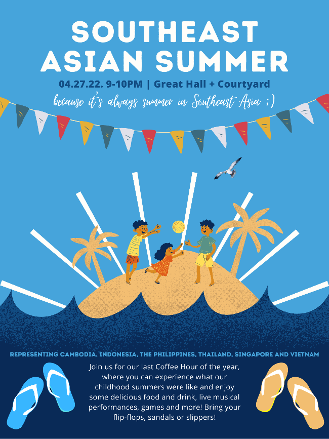 The final cultural event of the year was hosted by our Southeast Asian residents, who threw a lively summer-themed event. Being one of the lead organizers of this event, I truly enjoyed working with residents from Thailand, the Philippines, Singapore, Indonesia, Vietnam and Cambodia on putting together an event that was reminiscent of what our childhood summers were like. While preparing mango sticky rice and halo halo (a Filipino crushed ice dessert), we talked about how we each used to spend our summer vacation. I was surprised to find out that despite being from different countries, we shared many familiar experiences, from drinking Milo dinosaurs in the heat to playing flip-flop games. The event was a huge success, featuring live vocal performances in various different languages, a group tinikling dance from the Philippines and the aforementioned flip-flop games in our Heller Patio. Residents enjoyed the food and drink we made for them and it was very heartwarming to see everyone experiencing the joys of our Southeast Asian upbringing with us.