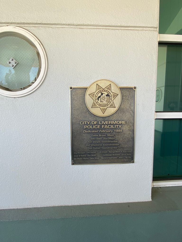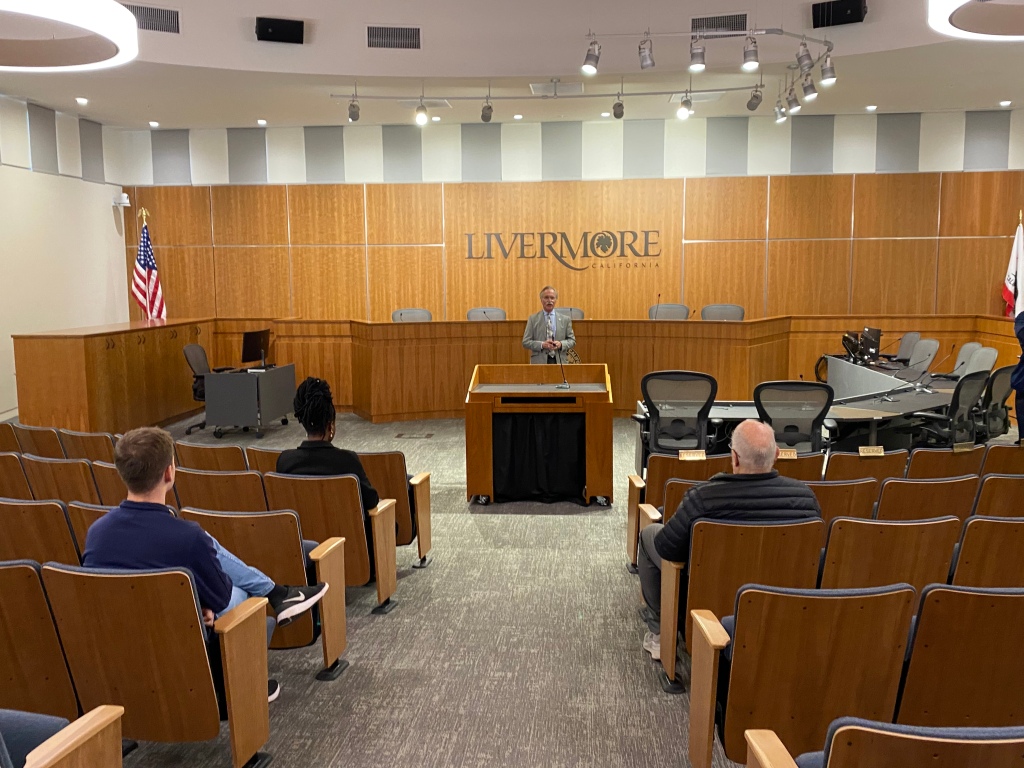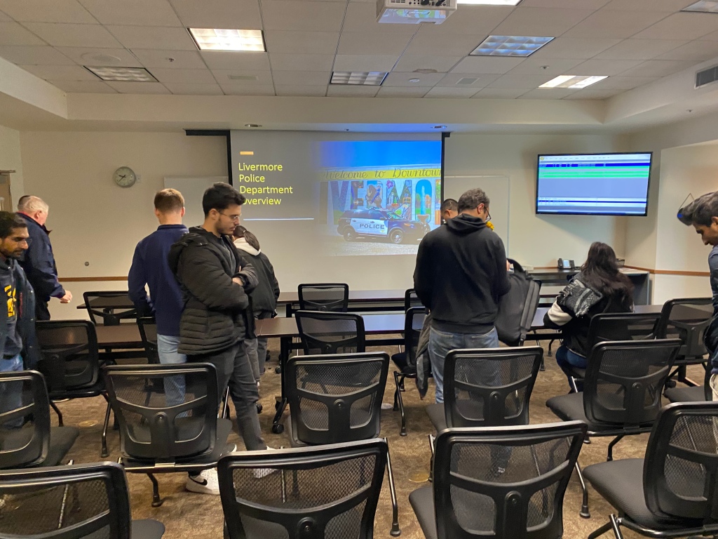 It wasn’t long before the Mayor of Livermore came to welcome us. The Honorable John Marchand, stout with a well-groomed mustache and a beige cowboy hat, walked in to address us. He presented through a slideshow the history of Livermore. The city of Livermore was incorporated in 1869. He went on to talk about the budget, resources, local council, wineries, and opportunities in the city. We followed the Mayor to the council meeting hall. He showed us the official seal of the city and many other exciting things about Livermore. We took some pictures with the Mayor and then the Police Captain came to pick us up for a tour of the Police Department.